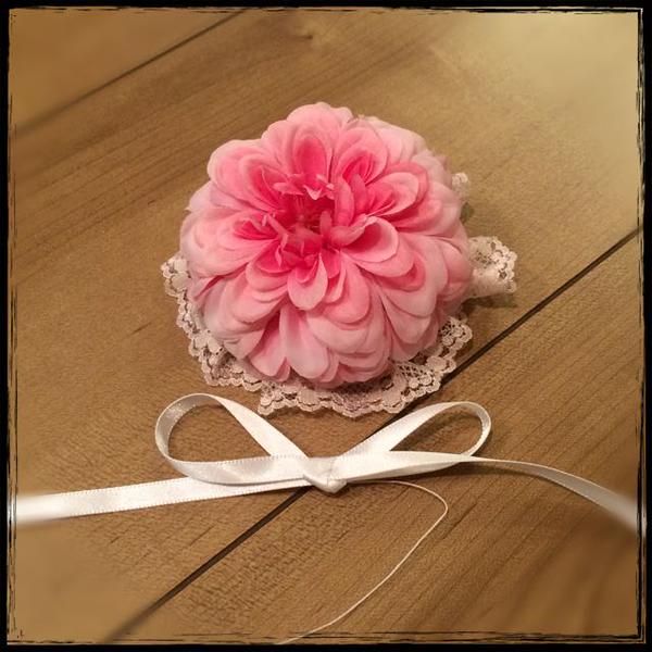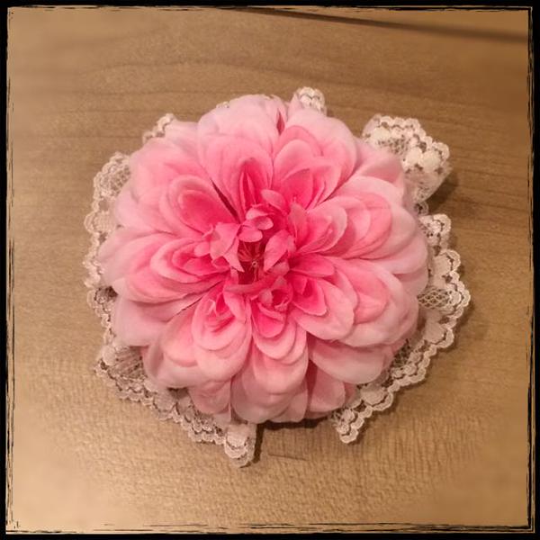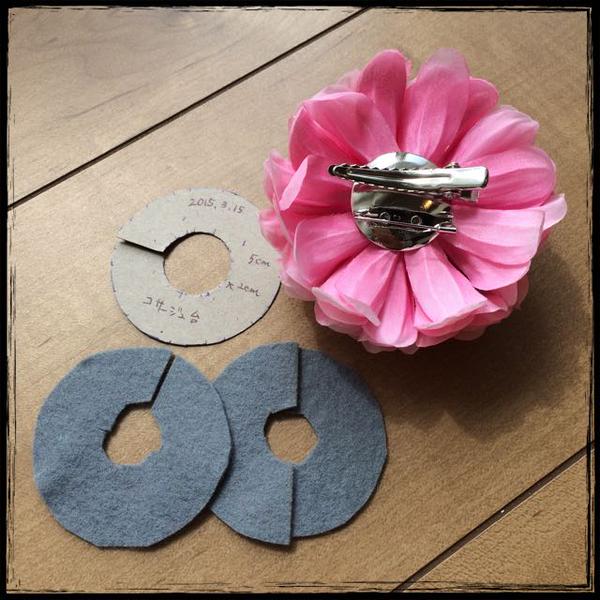 かがり縫いして、金具とお花の間に挟んで留めます。
